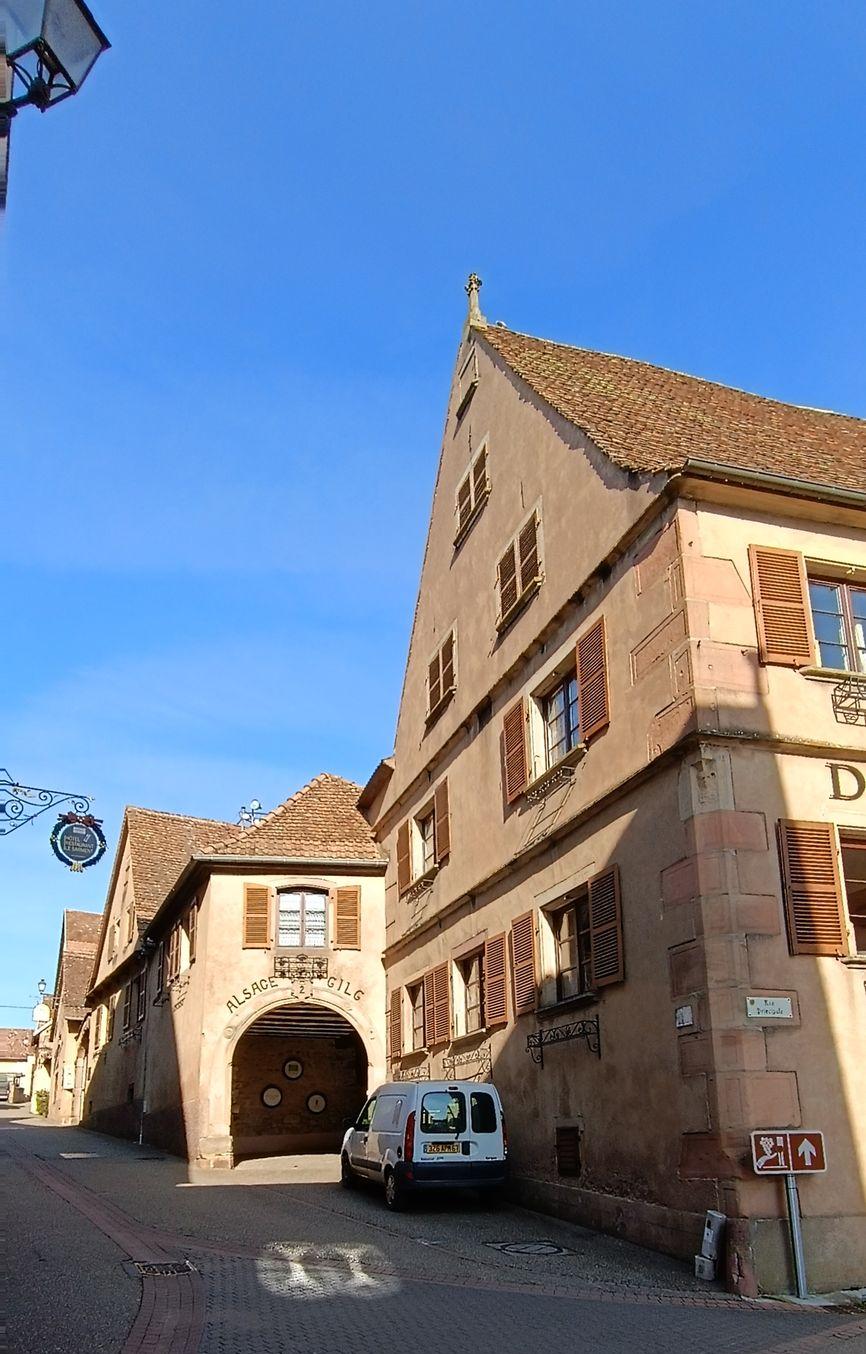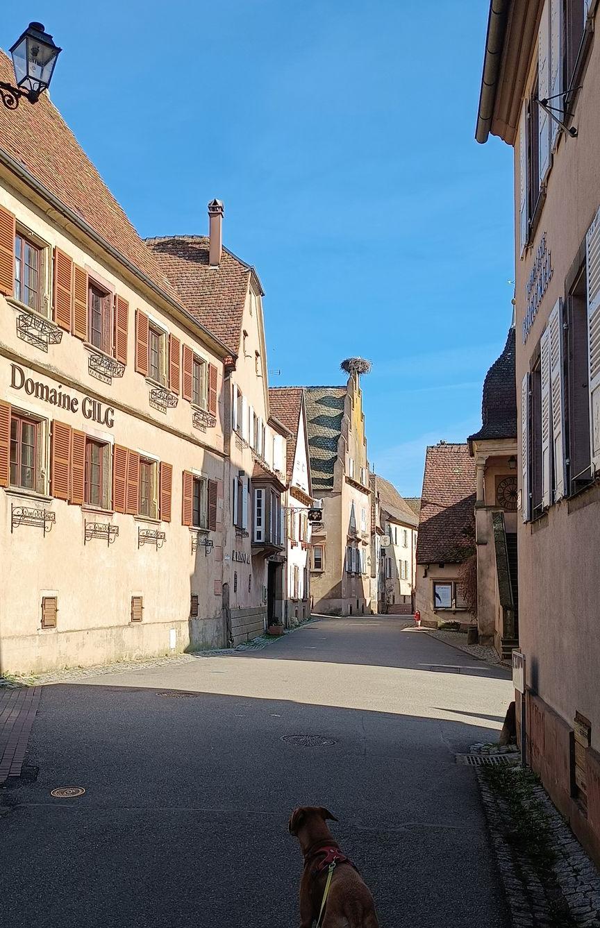 Ce village, très petit, ne manque pas de caves à vin à visiter. Nous avons choisi de nous arrêter chez Gilg où Plume a été la bienvenue dans la salle de dégustation.